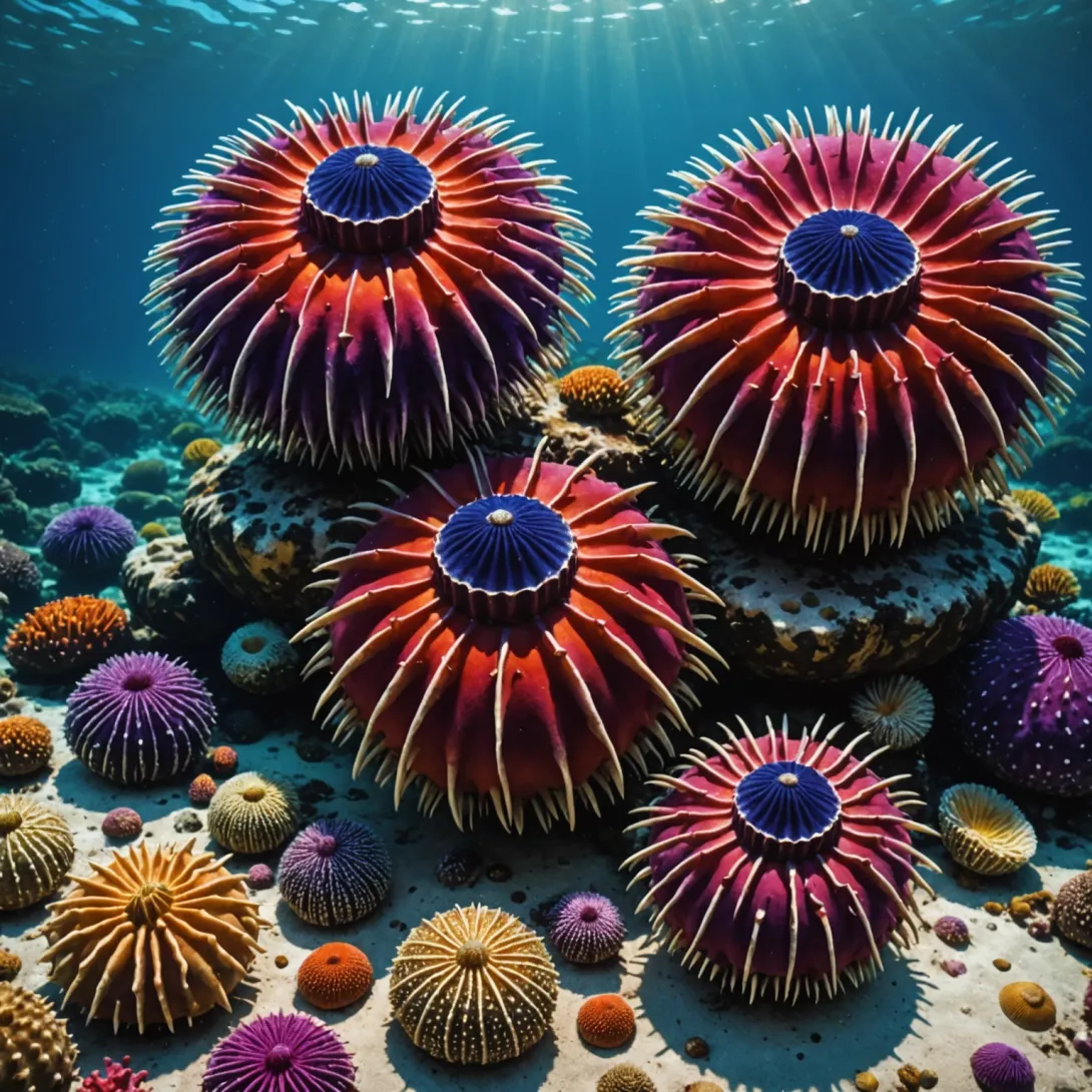 - Шляпочный морской ёж (род Toxopneustes) известен своими яркими цветами и характерной форме, напоминающей шляпу. Этот вид часто встречается в тропических водах и привлекает внимание дайверов и исследователей.